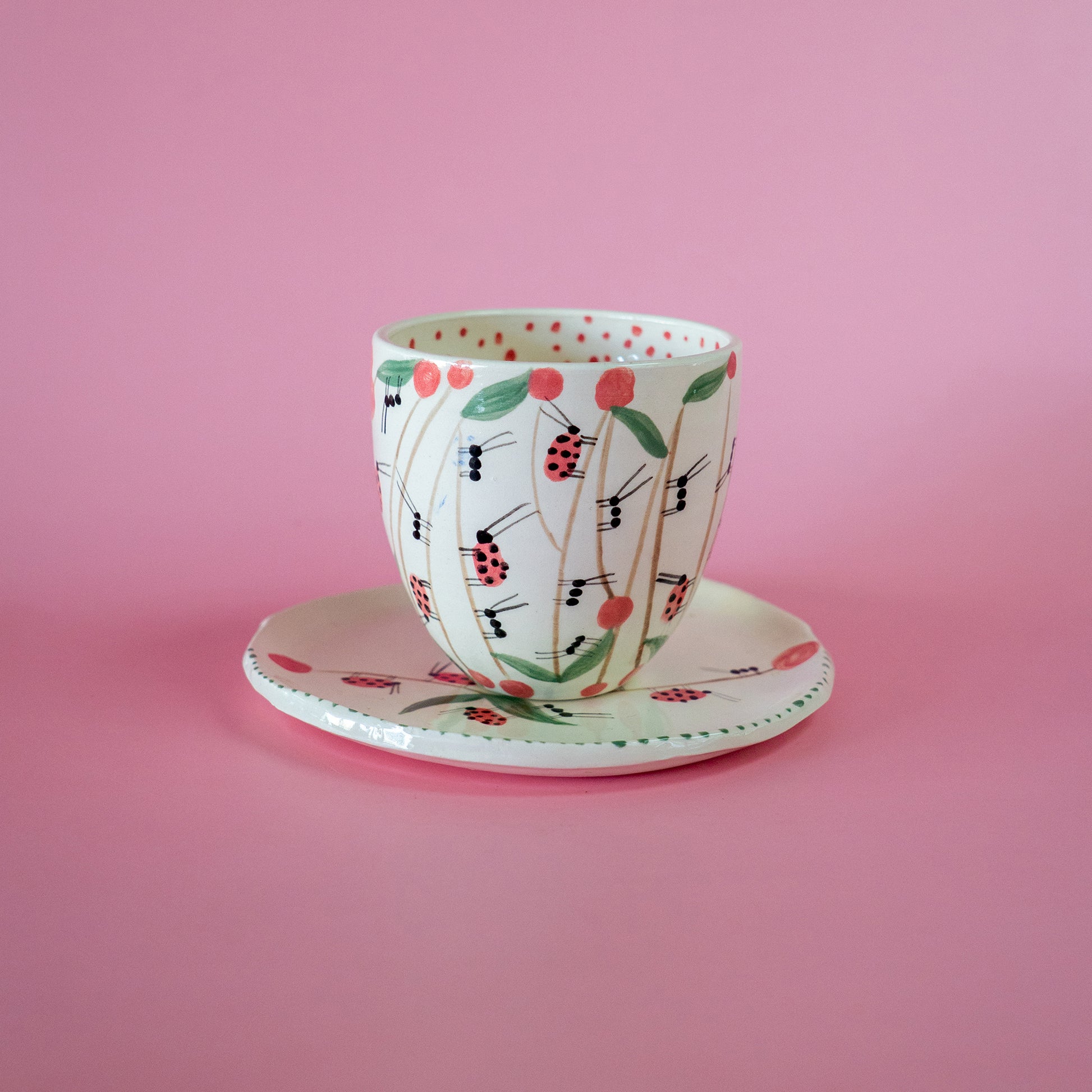 Handmade and hand-illustrated cup and saucer set, made with engobes.