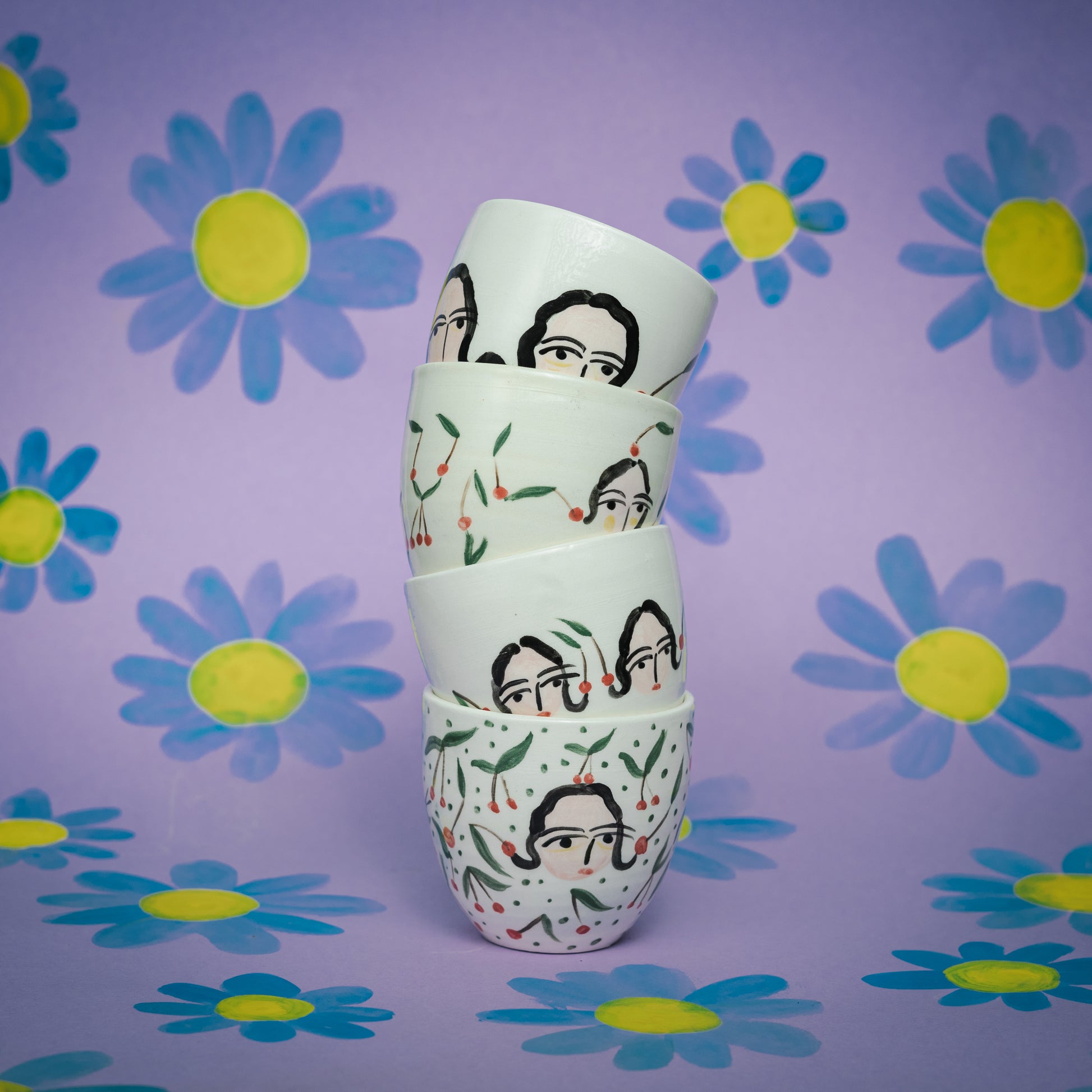 Set 4 taza sin asas hecho a mano e ilustrado con engobes.