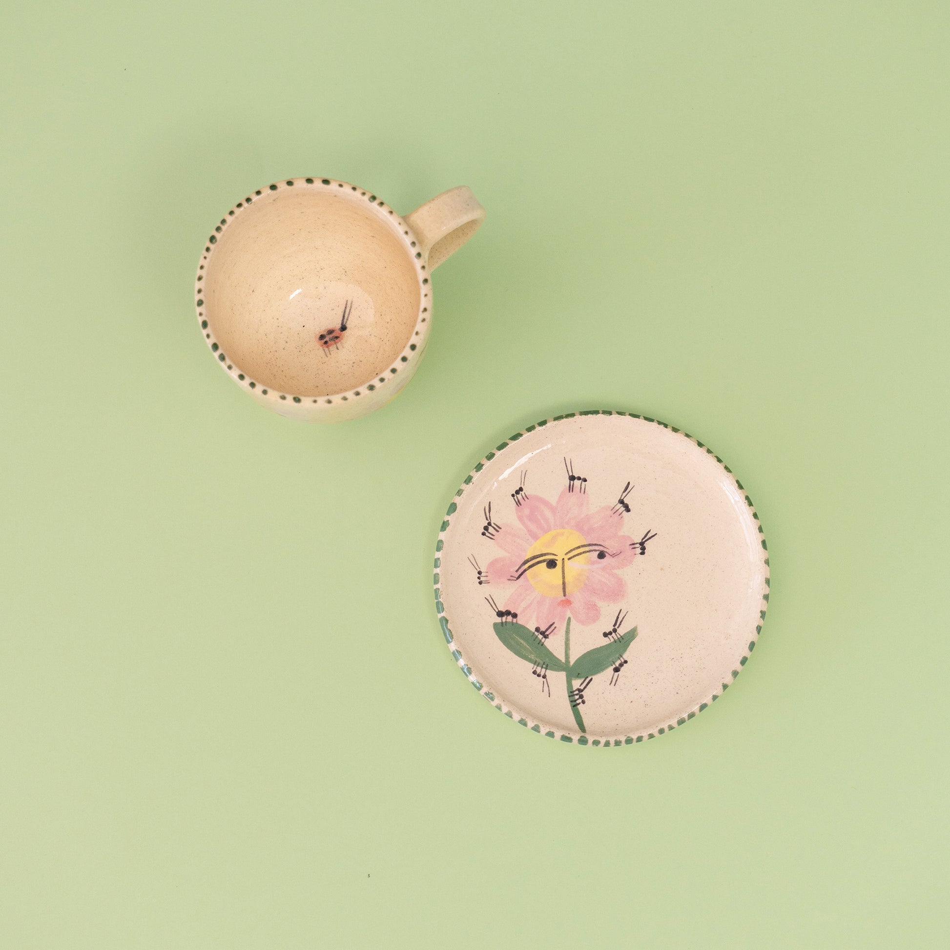Cup + Plate ""Ants walking on pink flowers" - Set de taza con asa "Hormigas paseando por flores rosadas"