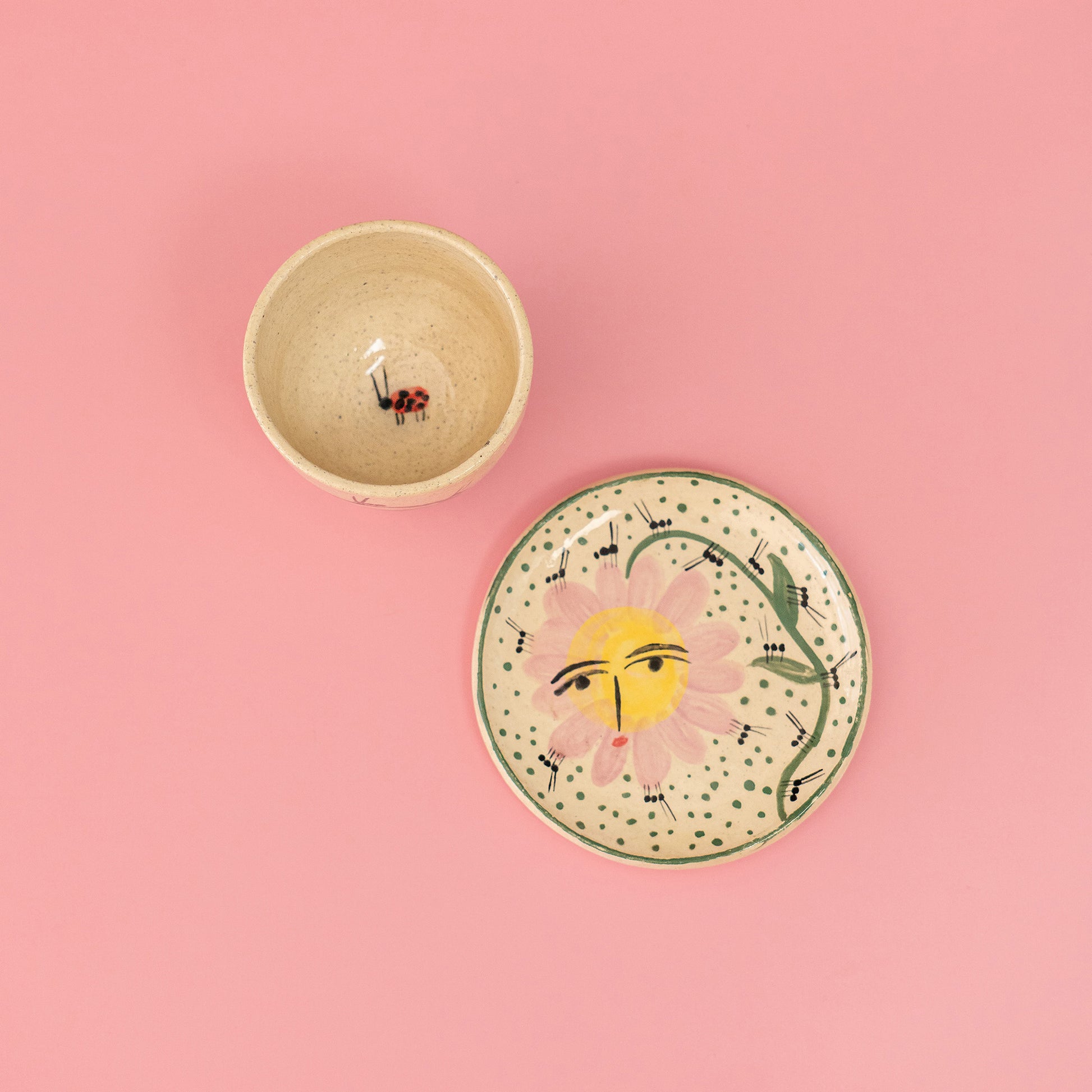 Cup + Plate "Pink flower judging the ants " - Set Taza Flor rosada juzgando a los hormigas